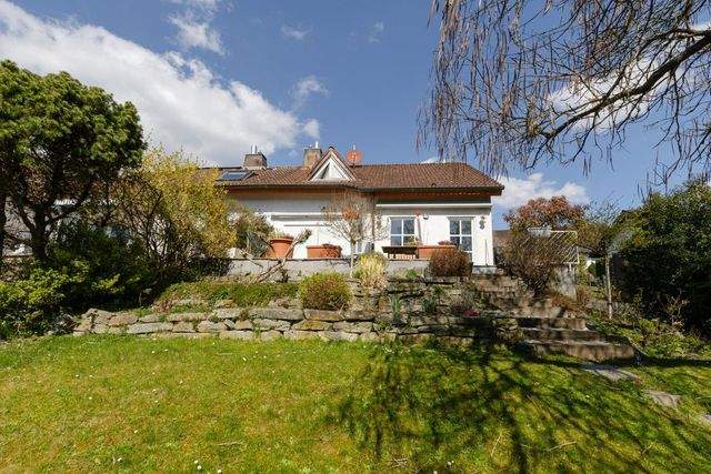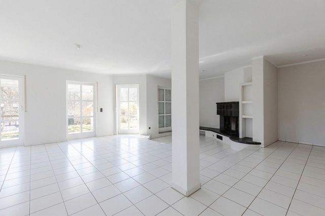 Das Herzstück des Hauses bildet der großzügige Wohnbereich mit gemütlicher Kaminecke, die besonders in den kühleren Monaten für eine behagliche Atmosphäre sorgt. Von hier aus gelangen Sie direkt in den traumhaften Garten, der mit viel Grün und Privatsphäre zum Entspannen und Verweilen einlädt.