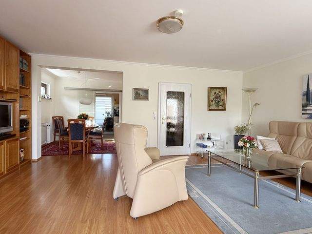 Von Ihrer modern eingerichteten Küche geht es über die platzsparende Glas-Schiebetür ins gemütliche Esszimmer, das zum Wohnraum hin geöffnet ist.