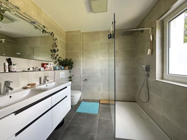 - Einbauküche, Einbauten, Lampen, Gardinenstanden, hochwertiger Holzboden (Eiche gebürstet & geölt) Kaminofen, 2 Terrassen, eigener Gartenanteil, 2 neuwertige Bäder mit Walk-in-Dusche