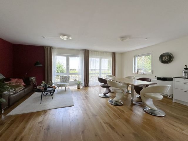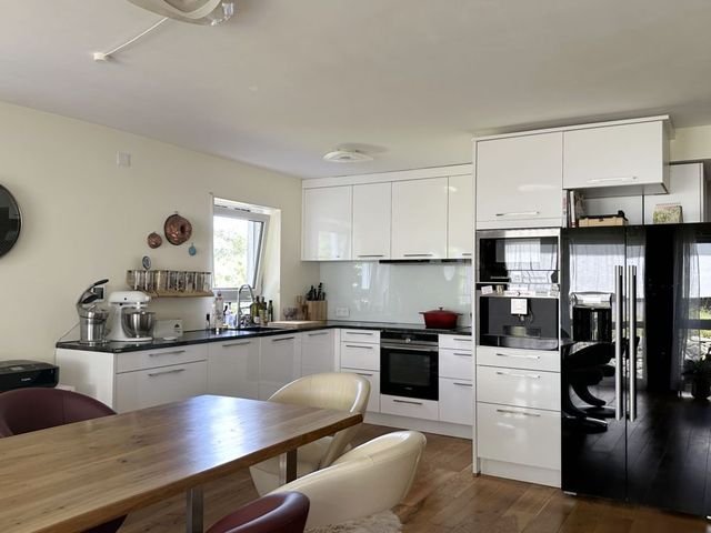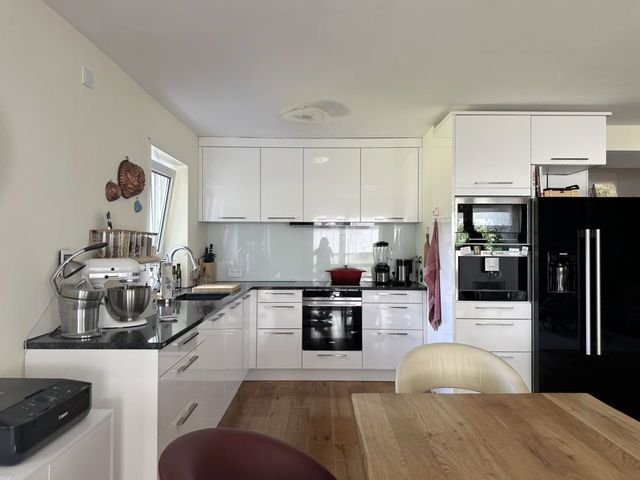Ihr offener Wohn-Essbereich mit dem tollen Holzboden ist hell und gemütlich zugleich. Hierfür sorgt unter anderem der kuschelige Kachelofen. Ihre offene Küche ist eine Augenweide und hat alles, was das Herz eines Hobbykochs höher schlagen lässt - inklusive dem flotten "Side-by-Side" Kühlschrank.