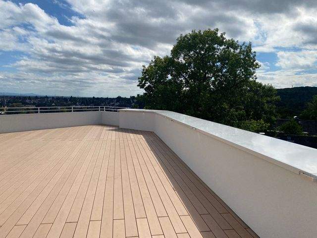 Im atmosphärischen Eingangsbereich, der als Lobby gestaltet wurde, treffen Sie sich mit Ihren Gästen oder anderen Bewohnern und nehmen in gemütlichen Lounge Sesseln Platz. An schönen Tagen genießen Sie die gemeinschaftliche Dachterrasse mit dem tollen Ausblick über ganz Hofheim.